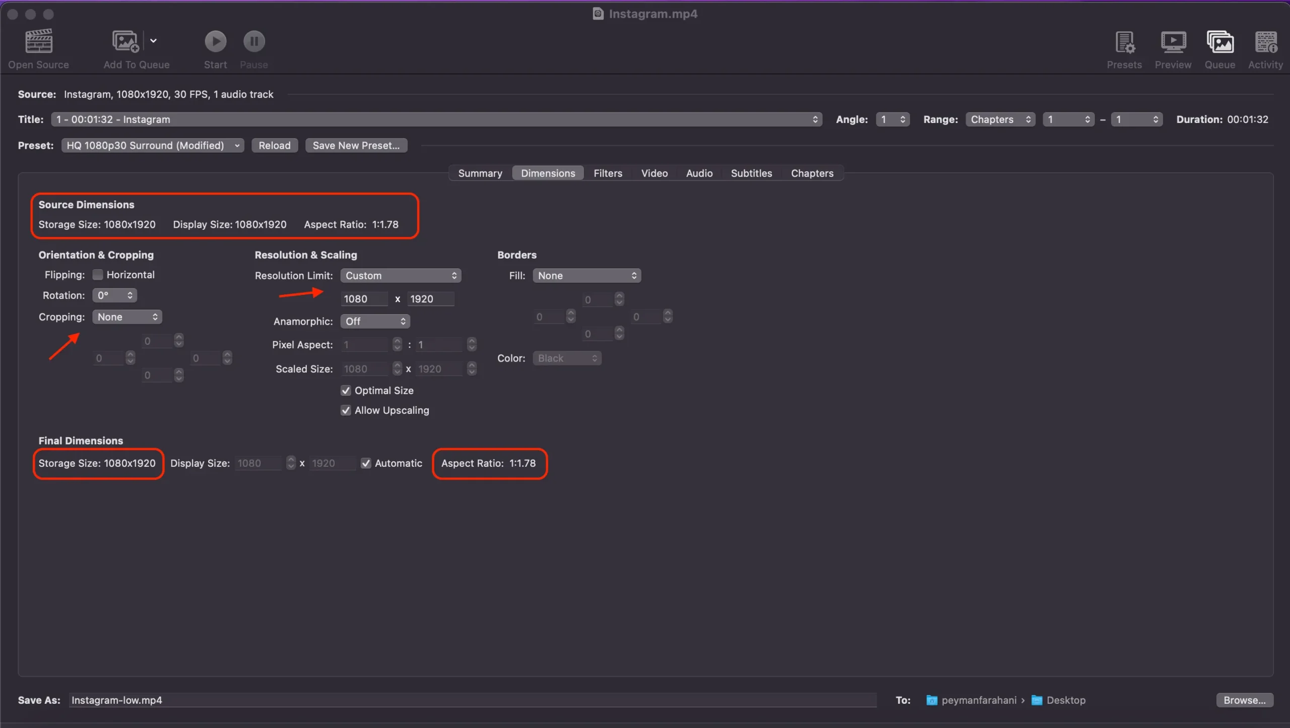توی بخش اول که Source Demensions هست ابعاد ویدئویی که آوردی توی این نرم افزار مشخص هست، مثل این تصویر باید عرض ۱۰۸۰ و ارتفاع ۱۹۲۰ باشه