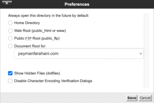 از بالای صفحه File Manager روی Settings کلیک کن و مطمئن شو گزینه “Show Hidden Files (dotfiles)” تیک خورده باشه.