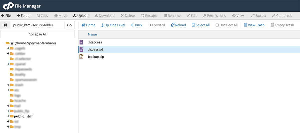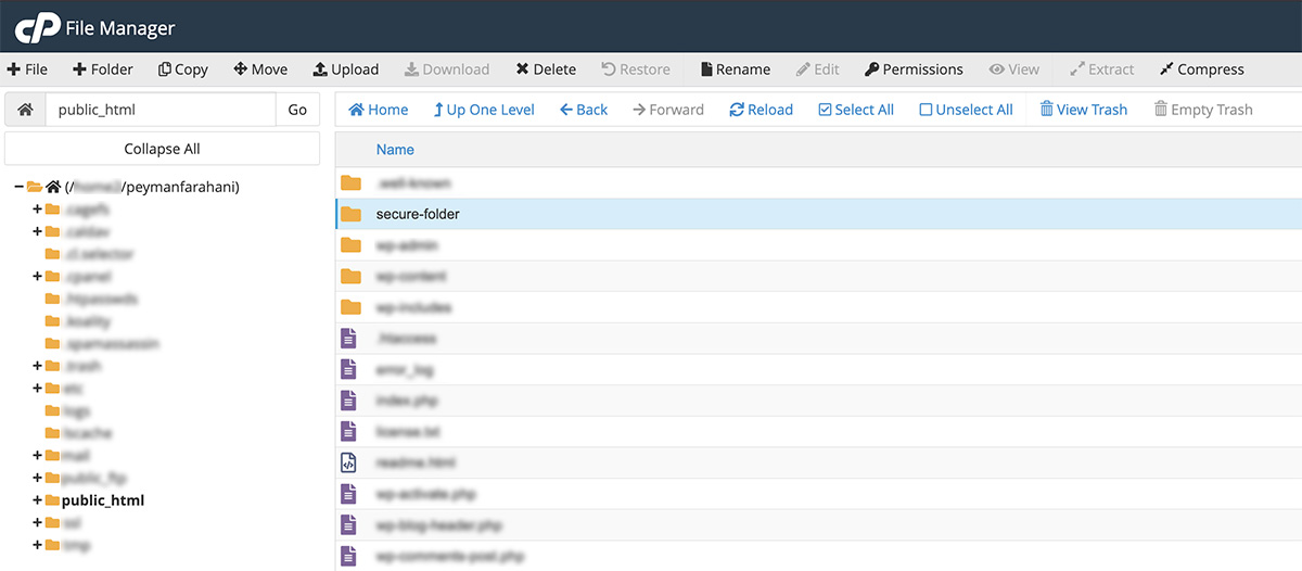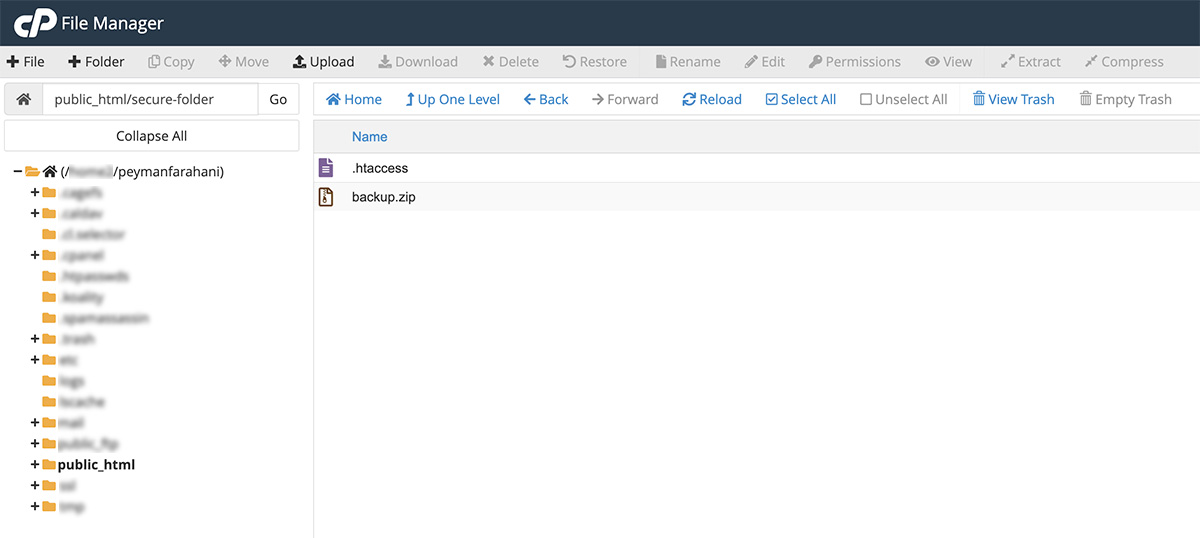 وارد cPanel شو، به مسیر public_html برو و یک پوشه جدید بساز (مثلاً secure-folder). بعد، فایل موردنظرت (مثلاً backup.zip) رو داخل همین پوشه آپلود کن.