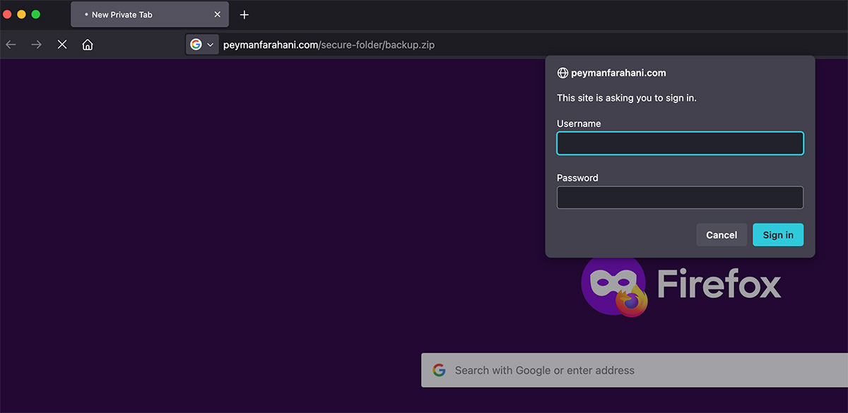 مرورگر باید ازت نام کاربری و رمز عبور بخواد. اگر اطلاعات درست وارد بشه، دانلود شروع میشه و اگر اشتباه باشه، دسترسی رد میشه.
